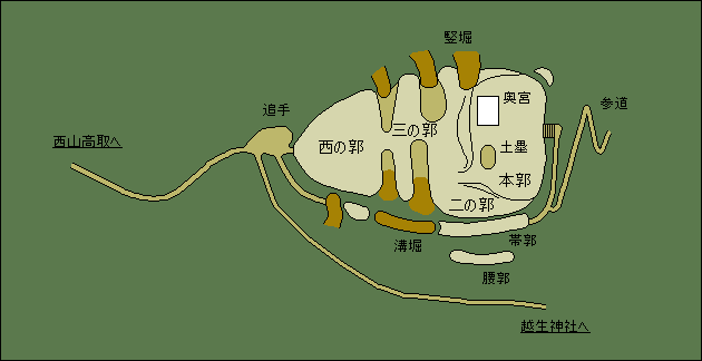 ●越生神社から奥宮への参道は急な斜面をつづら折で登る。そして、一方の登山道は南斜面を廻って追手にでるが、この道は寄せて来る敵勢に南斜面から側面攻撃を仕掛けられるように工夫されたものと考えられる。高取山城はもともと追手となる空間がさほどなく、敵勢が密集しても50人程度と推定され、兵が大量に動員される戦国期では追手の意味をなさない。したがって初期の高取山城の追手道は西山高取からの道と考えられる。すなわち、この道が追手に来襲した敵の背後を突く為に意識的に蛇行してつくられたものだとすれば、逃げ道(南面道)があっては追手の効果も期待できない。初期の追手道はあくまで少数の敵勢を想定したもので、この段階では南面道もなかったのではないだろうか。 さらに鎌倉期から南北朝争乱期の山城は山岳密教寺院と深い関わりをもつ。山城は本来、岩座信仰の中心として聖域空間であったが、一方ではその信仰上の脅威を利用して収穫物を守るというものでもあった。高取山城の場合はその規模からして初期の山城の特徴を色濃く残している。緊急時に物資の移動が容易な二の郭が農作物の貯蔵所として最も適していたと思われるが、やがて戦国期になって戦闘様式が一変し、収穫物の貯蔵所という機能は切り捨てられ、城の防備はさらに改修・強化されたのだろう。そしてまたこの頃、すでに越生一族は西国に移住している。守りの薄くなった東面に対処する為、越生氏の根小屋(居館)が上野から越生神社周辺に移される、という場面もあったように思う。 本郭には坂小口が設けられ、二の郭と三の郭は竪堀で区画され、それに続く西の郭は切落しで隔てられている。その縄張りからみて二の郭と三の郭は、もともと一つの郭であった可能性が高く、後に設けられた竪堀によって分割されたものとも考えられる。そしてさらに戦国期になって比較的傾斜の緩やかな南斜面に帯郭および腰郭を設ける事によって敵の攻撃を南斜面に集中させ、動員数の増した敵勢に対処する事を企図していたようだ。こうしてみると敵勢の兵力が小さく設定されていた初期の縄張りは次第に変更されてゆき、戦国期に突入してより戦闘的な城へと改修されたと考えてもよさそうだ。